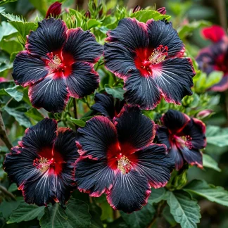 Садовый гибискус «Файер Дэнсер» — это настоящее произведение искусства, которое не оставит равнодушным ни одного ценителя прекрасного. Его крупные, почти чёрные цветки с огненно-красной каймой, словно языки пламени, притягивают взгляд и создают атмосферу загадочности и страсти. Представьте, как этот прекрасный гибискус будет смотреться в вашем саду на фоне зелени, словно таинственный цветок из сказочной страны!